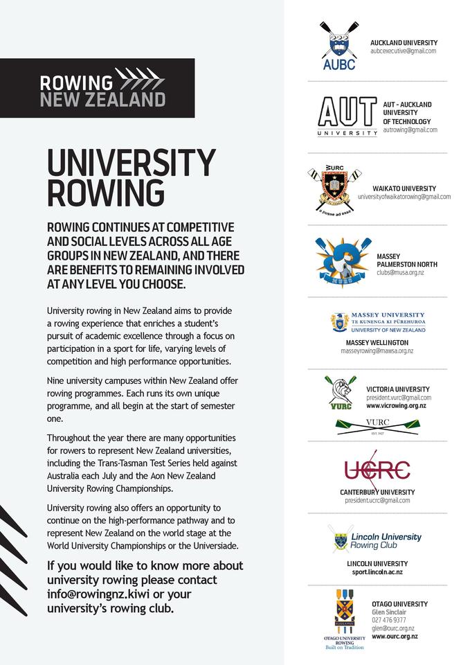 Nine university campuses within New Zealand offer rowing programmes. Each runs its own unique programme, and all begin at the start of semester one. Throughout the year there are many opportunities for rowers to represent New Zealand universities, including the Trans-Tasman Test Series held against Australia each July and the Aon New Zealand University Rowing Championships. University rowing also offers an opportunity to continue on the high-performance pathway and to represent New Zealand on the world stage at the World University Championships or the World University Games.