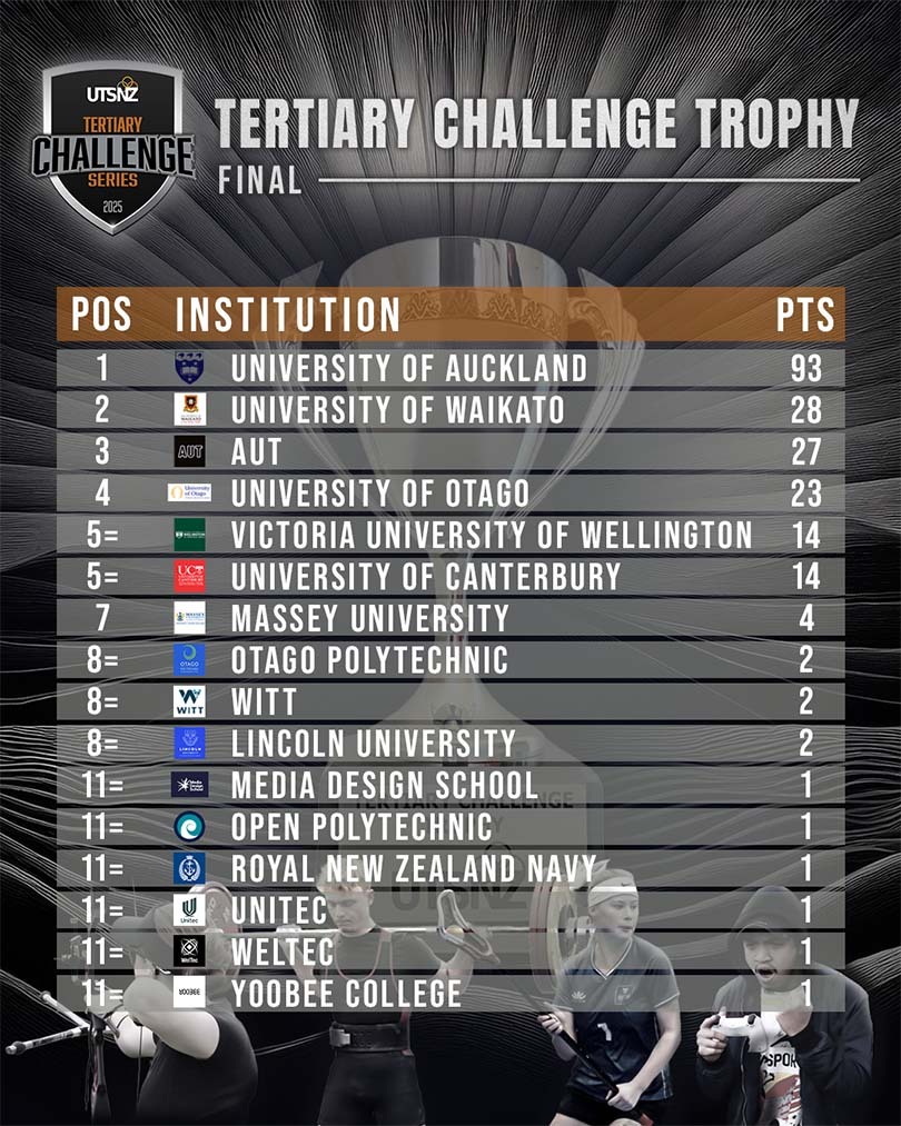 New for 2025, UTSNZ has added the Tertiary Challenge Trophy to it's awards list. The award will recognise the institution that demonstrates the highest level of student engagement in the UTSNZ Tertiary Challenge Event Series. Designed to provide fun, inclusive, and accessible opportunities for students across all institutions, the Challenge Series rewards participation over performance - every student entered earns a point for their institution, encouraging wider involvement in tertiary sport. The award celebrates the power of sport to bring students together, no matter their skill level or background or where they study.