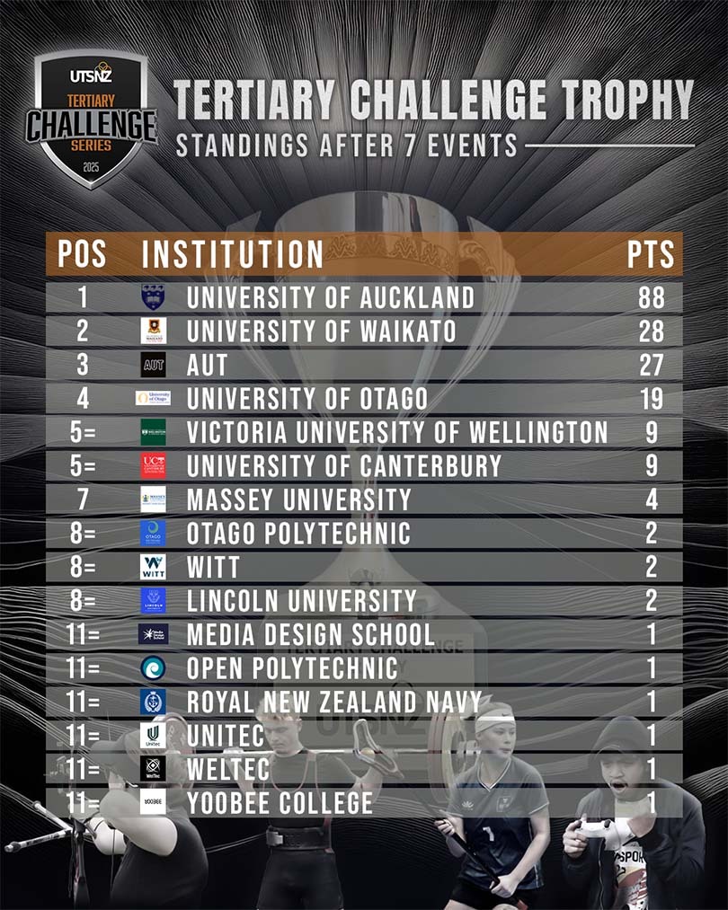 The UTSNZ Tertiary Challenge Series is a suite of online and physical events for current tertiary students from all institutions. They aim to cater for participants of all abilities from those who are new to the sport right through to those competing at the elite level. Through the Challenge Series, UTSNZ aims to continue to deliver quality events and contribute to a positive student experience by providing newly identified and online sports the opportunity to hold a tertiary event.
