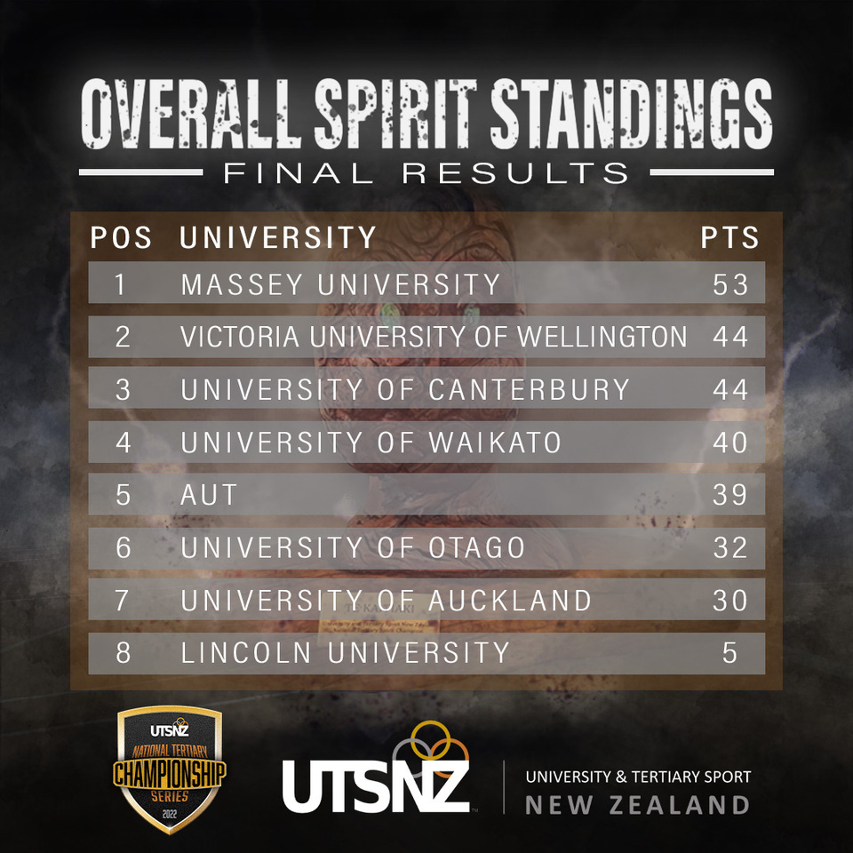 Awarded to the university that has displayed the best sportsmanship and captured the spirit of the national tertiary events over the course of the year, Massey University won the Te Kaitaki after consistently demonstrating their sporting mana with teams and participants upholding the values of kotahitanga, manaakitanga and rangatiratanga both on and off the field.